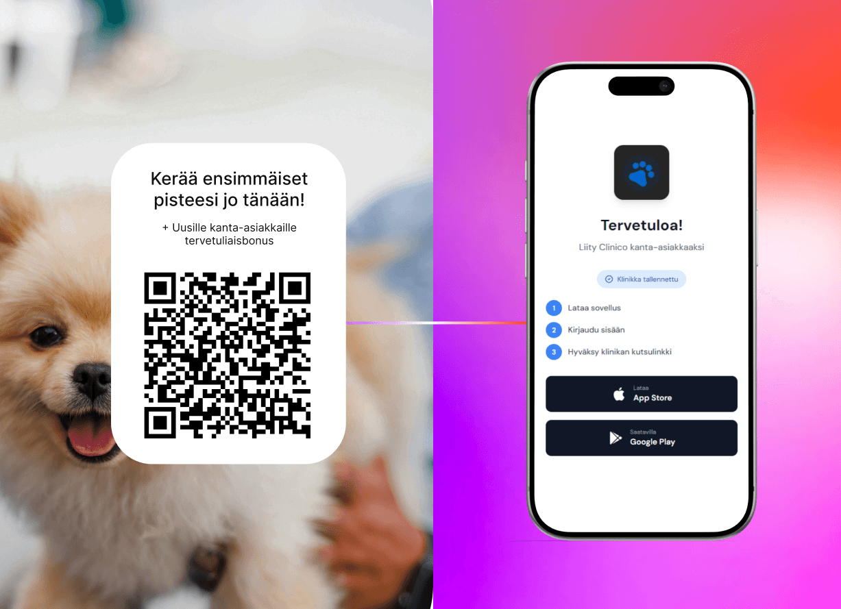 Klinikka App on klinikkasi oma brändätty mobiilisovellus. Tarjoa asiakkaillesi etuja & ominaisuuksia lemmikin arkeen.